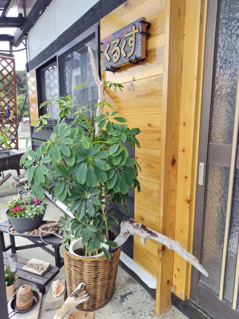 アトリエカフェく・るくすは山と樹木に囲まれた隠れ家カフェです。目的地に到着後、画像のような建物がく・るくすです。目印にされてください